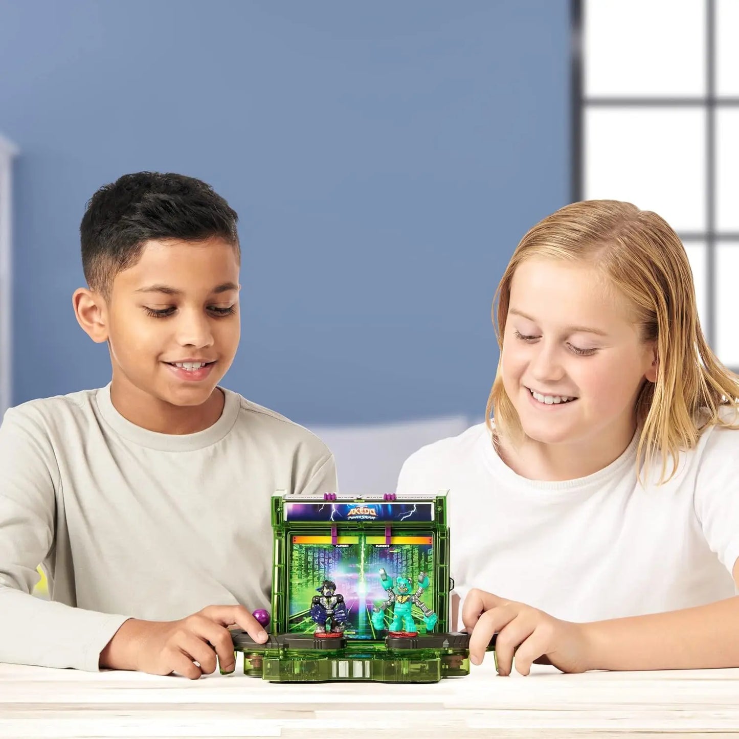 " Entre dans l’arène de combat des légendes d’Akedo Powerstorm pour devenir le meilleur guerrier des jeux d’arcade ! Ces combats sont loin d’être ordinaires. Choisis ton guerrier, bats-toi jusqu’au bout et achève tes adversaires par un Split Strike qui les fendra en deux ! GAME OVER ! Défie tes amis dans cette incroyable arène de combat. Ce ring inspiré des jeux d’arcade s’accompagne de 2 guerriers ultra rares exclusifs : Powerstriker Glitchblade et Powerstriker Shreddy Bear ! Place-les sur leurs manettes de combat respectives : que le combat commence ! Pendant l’affrontement, plus de 35 effets sonores tirés de combats réels retentissent dans l’arène ! Choisis un arrière-plan pour le combat dans l’arène, parmi les 2 proposés. Compte les points à l’aide des curseurs du tableau d’affichage situé au-dessus de l’arène. L’arène de combat Akedo Powerstorm fonctionne avec tous les guerriers Akedo pour que tu puisses organiser ton propre tournoi ! Tes guerriers feront-t-ils partie de l’équipe victorieuse et entreront-t-ils dans la légende d’Adeko ? Et ce n’est pas tout ! Cette arène électronique se transforme également en dojo Akedo ! Passe en mode Entraînement et connecte le sac d’entraînement pour que les guerriers puissent s’entraîner et perfectionner leur Split Strike. Il est temps de passer au VRAI combat de niveau supérieur !"