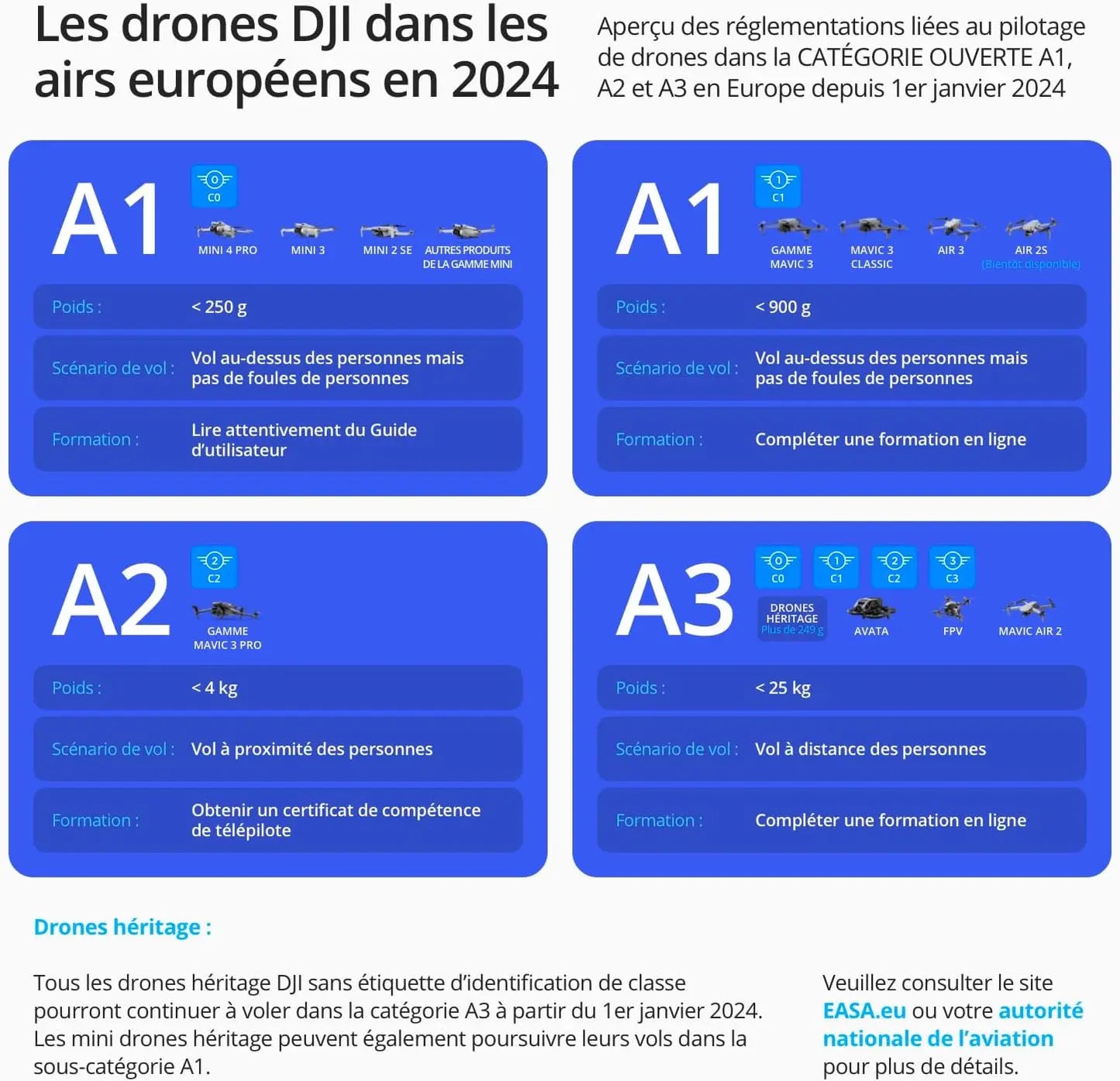 - Mini 3 se décline en deux versions : l’une avec et l’autre sans étiquette C0. Les deux versions sont autorisées pour les vols dans les catégories A1 et A3. Aucun test n’est donc exigé pour les opérateurs.