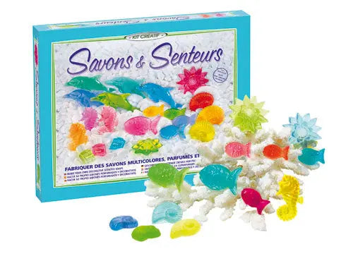 Ce coffret permet de réaliser de ravissantes savonnettes de très grande qualité grâce à la base glycérinée transparente proposée. La base fond en quelques secondes au micro-ondes. Dès qu'elle devient liquide, l'enfant peut doser les différents parfums et colorants avant de couler la solution dans un moule. En quelques minutes, le savon refroidit et prend la forme de coeurs, fleurs,coquillages ou poissons qu’il est aisé de démouler. Testés sous contrôle médical, les peaux les plus fragiles peuvent les utiliser sans risque.