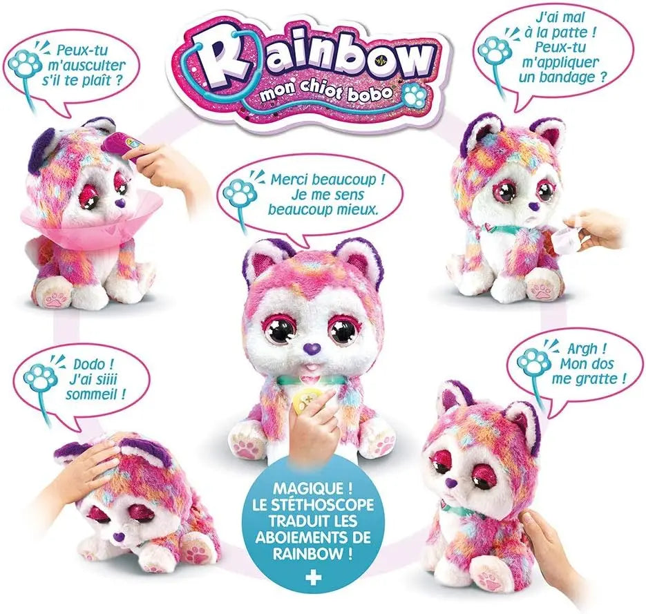 - Interactif : Rainbow est un petit chien malade entièrement motorisé dont il faut prendre soin : Rainbow bouge la tête, cligne des yeux, se couche et se relève