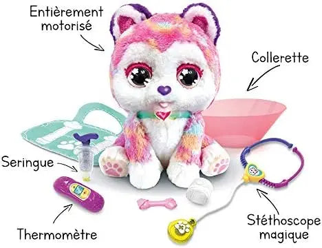 - Inclus : 1 thermomètre pour prendre la température, 1 stéthoscope pour écouter son coeur battre et traduire tout ce qu'il dit, 1 piqûre, 1 pansement, 1 collerette, 1 os pour le nourrir, 1 sac de soin