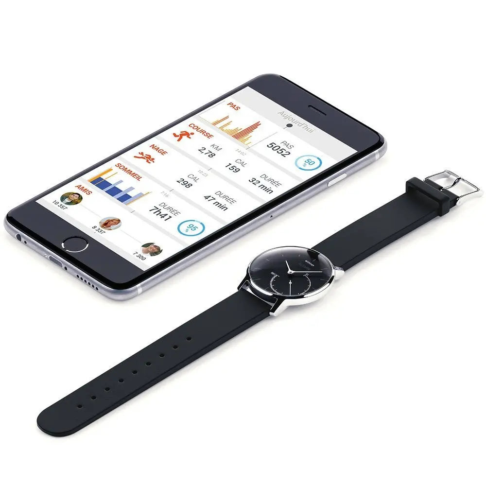 Activité Steel - Montre connectée, bracelet en silicone - Fonctionne avec 1 Pile bouton CR2025 - Noir - Compatible iOS / Android - Données :Pas, distance, calories, course, narge... - Poids : 37g / Etanche : 50 m - Verre en saphir - Précision suisse et élégance française - App gratuite à télécharger sur l'App Store