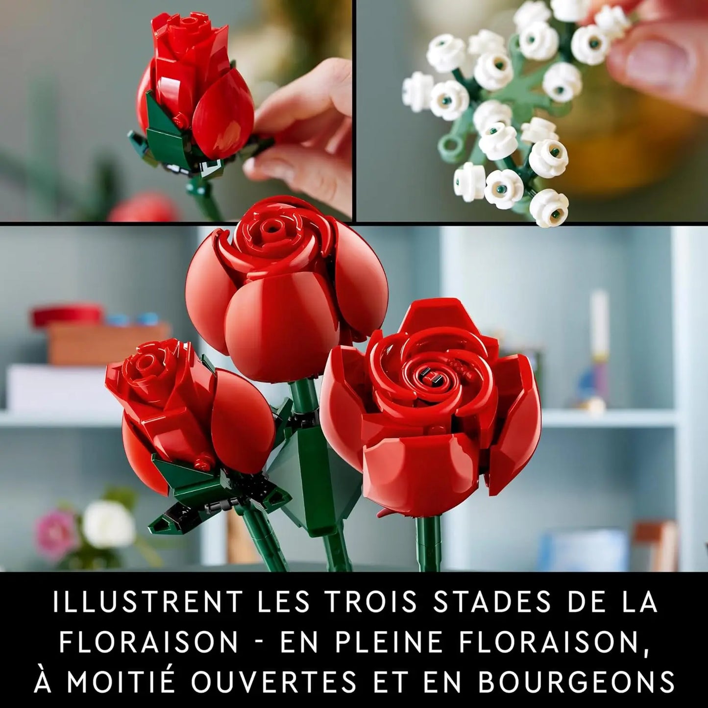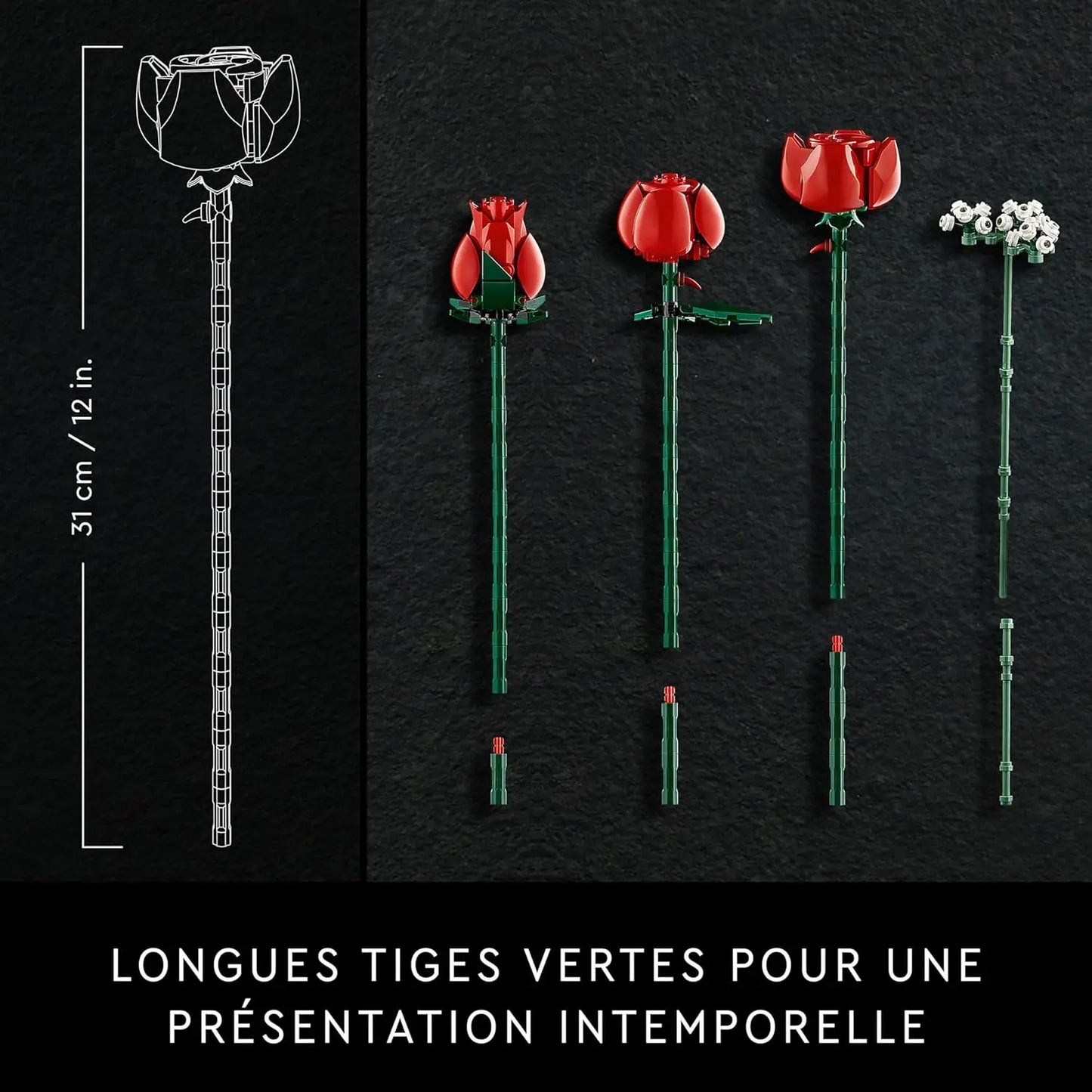 Ce bouquet de roses LEGO offre un plaisir de construction immense et représente douze roses rouges à différents stades de floraison (4 roses en pleine floraison, 4 à moitié ouvertes et 4 bourgeons). Grâce aux longues tiges vertes, vous pouvez facilement les présenter dans un vase. Quatre branches de gypsophile avec de petites fleurs blanches complètent le bouquet. Le set comprend 6 sachets de briques et des instructions de construction séparées pour les roses artificielles à différents stades d'ouverture, afin que d'autres puissent participer à la construction. Une version numérique des instructions de construction est disponible dans l'application LEGO Builder. L'éventail inspirant de projets de construction LEGO créatifs conçus spécialement pour les adultes vous offre un espace pour vous détendre.